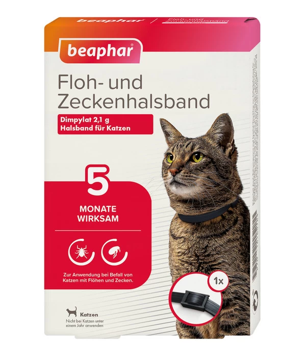 Beaphar Floh- und Zeckenhalsband für Katzen. Wirkstoff: Dimpylat. Anwendungsgebiete: Zur äußerlichen Anwendung bei Befall von Katzen mit Ektoparasiten. Warnhinweis: Floh- und Zeckenhalsband für Katzen ist für den äußerlichen Gebrauch zur Insektenvernichtung bestimmt und darf weder von Tieren noch von Menschen innerlich aufgenommen werden. Tiere mit Floh- und Zeckenhalsband für Katzen sind von Säuglingen und Kleinkindern fern zu halten. Zu Risiken und Nebenwirkungen lesen Sie die Packungsbeilage und fragen Sie den Tierarzt oder Apotheker.