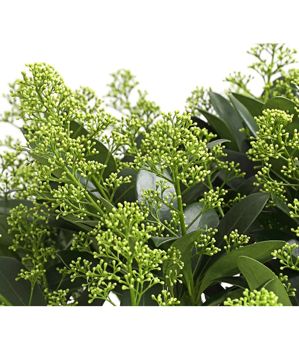 Jeder Gärtner weiß, dass eine Gartenanlage erst wirklich als gelungen gilt, wenn sie sich zu jeder Zeit von ihrer besten Seite zeigt. Deshalb werden gerne laubabwerfende und immergrüne Pflanzen gemixt. Aber wenn im Winter der Blick ausschließlich auf grüne Blätter oder Nadeln fällt, kann das ganz schön eintönig wirken, finden Sie nicht? Umso wertvoller sind deshalb Pflanzen wie die Blütenskimmien, die neben einem schönen immergrünen Blattschmuck bereits im Herbst dekorative Blütenknospen tragen, die dann im zeitigen Frühjahr aufblühen und herrlich duften. Die Blütenskimmie ‘White Lady‘, die wir Ihnen hier präsentieren, hat Weiß als Blütenfarbe gewählt, die sich als Knospe wie als Blüte besonders effektvoll von dem dunklen Blattgrün abhebt. Verzichten Sie nicht auf diese außergewöhnliche Winterschmuckpflanze, die sich mit ihrer maximalen Wuchshöhe von ca. 100 cm auch in kleinere Gärten gut einfügt.