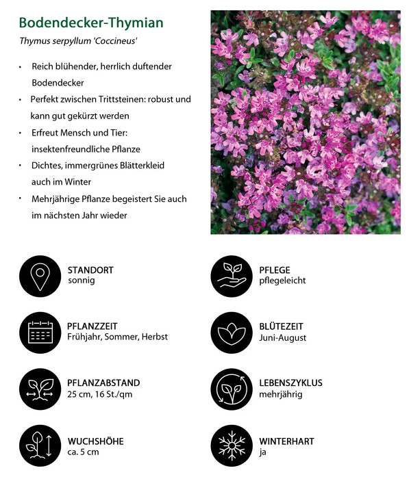 Thymian ist eine extrem anspruchslose Pflanze. Sie wächst gerne auf trockenen und sandigen Böden, kommt aber auch mit normaler Gartenerde zurecht. Wichtig ist nur, dass der Boden gut durchlässig ist, denn Staunässe bekommt der Pflanze schlecht. Wenn der Standort dann noch ausreichend sonnig ist, wird die Staude prächtig gedeihen und sie mit gesundem Wuchs und einer langen Blüte erfreuen. Die Pflanze ist winterhart und braucht keinen Winterschutz. Wir empfehlen, die Pflanze alle paar Jahre im Frühjahr zurückzuschneiden, damit sie ihren dichten Wuchs behält.