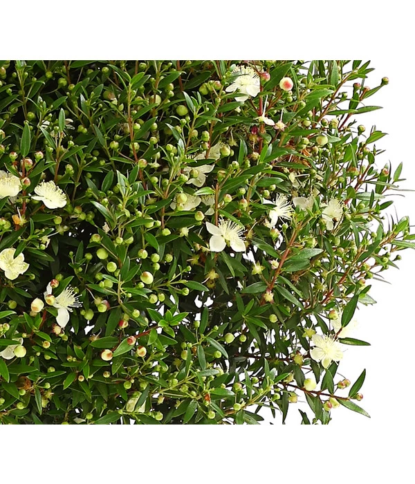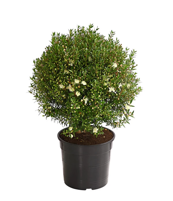 Mediterrane Kübelpflanzen sind in der Sommerzeit gern gesehene Gäste auf Balkon oder Terrasse. Zwar ist die Brautmyrte ein eher seltener Gast, doch der immergrüne Busch bereichert uns mit zierlichen Blüten und wohlriechendem Duft. Die dunkelgrünen Blätter der Myrte geben beim Zerreiben einen ätherischen Geruch ab, auch die kleinen, weißen Blüten verströmen ein angenehmes Aroma. Die Blüten entwickeln sich im Herbst zu dunkelroten bis gänzlich schwarze Beeren, die zwar essbar sind, aber keine große kulinarische Bedeutung haben. Das ätherische Öl der Myrte wird allerdings gerne in der Parfümindustrie verwendet und ist dort als Engelswasser bekannt. Bereits die Griechen und Römer sahen ein besonderes Symbol in der Brautmyrte. Der Legende nach, entstammte sie aus dem Paradies und galt als Symbol für Reinheit, Schönheit und Jungfräulichkeit. Nicht nur Aphrodite schmückte sich mit dieser Pflanze, auch in Deutschland wurde es im 16. Jahrhundert zur Sitte eine jungfräuliche Braut mit einem Myrtenkranz zu schmücken. Das erklärt auch ihren deutschen Namen.