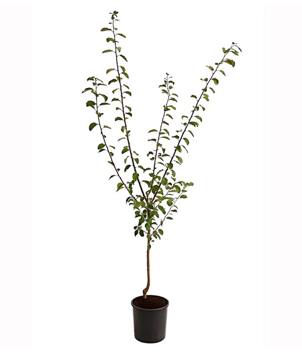 Die Aprikosenmirabelle ‚Aprimira‘ ist keine Kreuzung aus Aprikose und Mirabelle, wie man vermuten würde. Sie stammt auf jeden Fall von der Mirabelle ‚von Herrenhausen‘ ab, welche von einer Pflaume bestäubt wurde. ‚Aprimira‘ hat also mit Aprikosen gar nichts zu tun, bis auf den ähnlichen Geschmack. Die Früchte sind gelb-orange und haben sonnenseits rosa-violette Bäckchen. Ihre Größe und die länglich-ovale Form erinnern an Pflaumen. Das Fruchtfleisch ist gelblich, fest und honigsüß mit einem leichten Aprikosenaroma. Auch die Blüten erinnern eher an Zwetschgen, sie sind sehr klein, weiß und in einer hohen Anzahl an der Pflanze verteilt. Da die Blütezeit sehr früh ist, sind die Blüten etwas Spätfrost gefährdet. Geerntet werden die leckeren Früchte übrigens zwischen August und September. Man spricht bei ‚Aprimira‘ von einer Verbesserung der Mirabelle ‚von Nancy‘, denn sie ist größer und hat ein feineres Aroma.