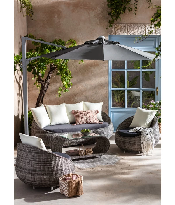 Sie haben schon lange nach einer ganz besonderen Loungegruppe gesucht und nun sind Sie begeistert von Ihrer Entdeckung: der Dehner Geflechtlounge Avani. Das liegt ganz sicher an der außergewöhnlichen Formenwahl, denn sowohl das 2-sitzige Sofa als auch die beiden Sessel sind rund. Eine der wohl schönsten, gefälligsten Formen der Natur, in der Sie sich wirklich rundum wohlfühlen werden! Ausgestattet mit 3 hochwertigen Sitzkissen in Dunkelgrau und 6 Rückenkissen in hellem Beige sind Ihre neuen Möbelstücke fürs Outdoor-Wohnzimmer unendlich bequem. Auch der Tisch brilliert mit einem genauso außergewöhnlichen wie praktischen Design, fügt sich damit in die hochmoderne Formensprache der Dehner Geflechtlounge Avani ein und schmückt sich mit einer 5 mm starken, gehärteten Glasplatte, auf der sich Snacks wie Gläser perfekt abstellen lassen. In Verbindung mit der natürlich abwechslungsreichen Maserung des hochwertigen Kunststoffgeflechts eine topaktuelle Loungegruppe, die auf ihren schmalen Füßchen förmlich zu schweben scheint. Lassen Sie die Dehner Geflechtlounge Avani also schon bald auf Ihrer Terrasse landen!
