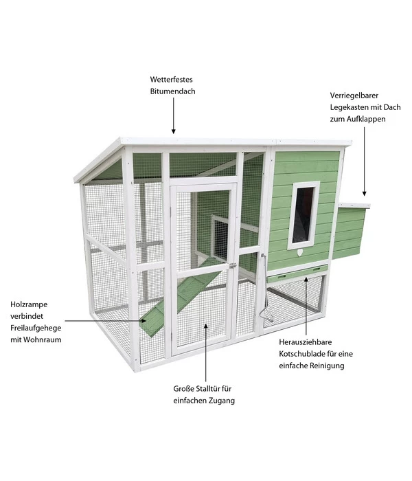 Wenn Sie sich für die Haltung von Federvieh begeistern, wird Sie der Hühnerstall Happy Farm Lotti in der bekannten Dehner Markenqualität sofort in seinen Bann ziehen. Das Geflügelhaus ist eine Zierde in jedem Garten und bietet zahlreiche Features, die den Produzenten leckerer Frühstückseier ein schönes und artgerechtes Umfeld bieten. Schon die ländliche Architektur sowie die farbliche Gestaltung des Stalls und des einbezogenen Freiluftbereiches sind attraktiv anzusehen. Das Hühnerhaus enthält zwei gemütliche Sitzstangen aus Holz, auf denen sich Ihre Lieblinge wohlfühlen können.