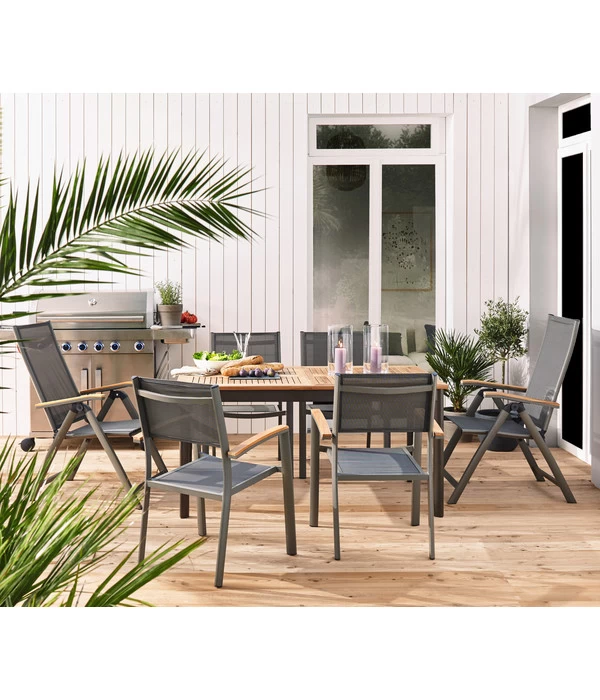 Der erste sonnig-warme Frühlingstag ist immer ein ganz besonderes Ereignis im Jahresverlauf, denn dann wird der Klappstuhl ‚Colmar‘ aus seinem Winterschlaf geholt und darf Sie mit seinem Komfort verwöhnen. Am liebsten von morgens früh bis abends spät, an jedem schönen Sommertag! Es könnte tatsächlich sein, dass Sie, sobald Sie den Klappstuhl ‚Colmar‘ bei sich zu Hause haben, weniger das Bedürfnis haben, abends noch einmal aus zu gehen, sondern es genießen, den Feierabend gemütlich auf der Terrasse zu verbringen. Wo jeder – Familie, Freunde, Nachbarn – einen herrlich bequemen Klappstuhl ‚Colmar‘ zur Verfügung hat! Doch man sitzt nicht nur einfach gut in diesem Gartenstuhl, sondern sein Design ist elegant und funktional zugleich. Die Materialkombi aus Metall, Kunststoffgewebe und Teakholz liegt im Moment voll im Trend, ist aber zugleich so zeitlos, dass Ihnen der Klappstuhl ‚Colmar‘ auch in vielen Jahren noch so gut gefallen wird wie am ersten Tag.