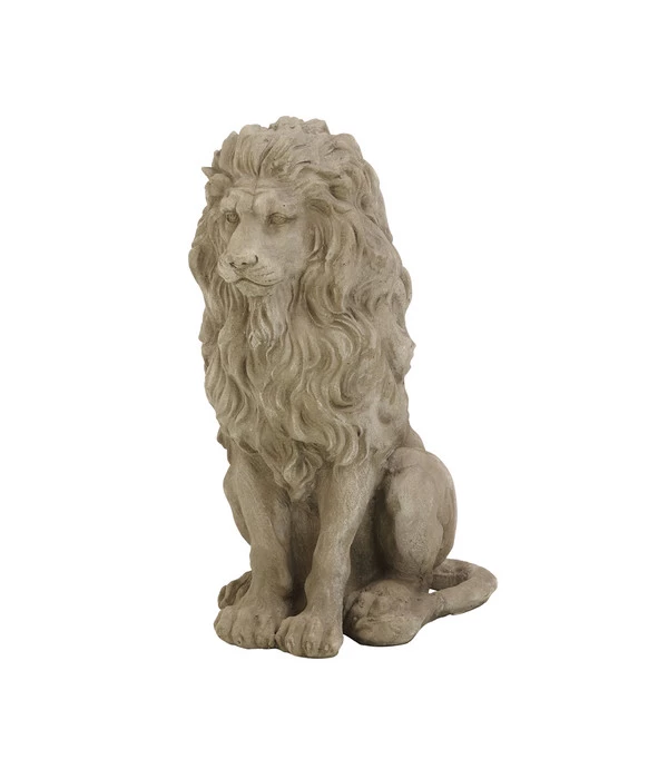 Dieser Magnesia Löwe macht jedem Betrachter auf den ersten Blick klar, was man unter einer echten ‚Löwenmähne‘ zu verstehen hat! Obwohl in Steingrau und nicht in leuchtendem Rotblond wie bei den lebendigen Löwen, trägt der Magnesia Löwe die weit über die Schultern wallende Lockenpracht mit königlichem Selbstbewusstsein. Überhaupt strahlt der Magnesia Löwe so viel majestätische Gelassenheit aus, wie sich mit der erkennbaren Aufmerksamkeit für seine Umgebung vereinbaren lässt. Voll Vertrauen in seine Kraft und Geschwindigkeit, mit der er sich in Sekundenschnelle aus der sitzenden Position heraus auf seine Beute stürzen könnte, ist der Magnesia Löwe der traditionelle ‚Wächter‘ für herrschaftliche Anwesen. Nicht ohne Grund saß und sitzt der König der Tiere seit Jahrhunderten an den Eingangsportalen oder Einfahrten zu Stadtschlössern wie zu Landsitzen.