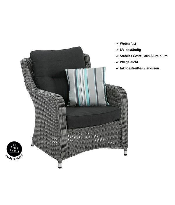 Ein hochwertiges Geflecht in Naturrattan-Optik, eine elegant beschwingte Form und erstklassiger Sitzkomfort – damit wird sich der Dehner Sessel ‘Toska‘ ganz schnell zu Ihrem neuen Stammplatz unter freiem Himmel entwickeln, an dem Sie am liebsten jede freie Minute verbringen würden. Von den ersten wärmenden Sonnenstrahlen im Frühling bis in den goldenen Herbst. Und was das Beste ist: Er kann als einladender Solist auf dem Balkon, der Terrasse oder im Wintergarten einen Platz finden, Sie können den Gartensessel aber auch mit dem Sofa aus der gleichnamigen Gartenmöbelserie kombinieren und eine größere Sitzgruppe bilden lassen. In jedem Fall wird Sie der Flechtsessel mit luxuriösem Sitzkomfort verwöhnen. Dafür sorgt neben der komfortabel großen Sitzfläche, der hohen Rückenlehne und den Armlehnen vor allem das dicke Sitz- und Rückenpolster. Das i-Tüpfelchen ist das modisch gestreifte Zierkissen, das auch einen frischen Farbtupfer auf die dunklen Polster setzt. Genießen Sie bald entspannte Stunden in Ihrem Dehner Sessel ‘Toska‘ – viele Jahre lang!