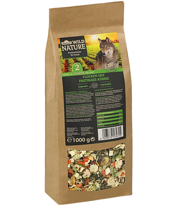 Auch Ihr Hund ist, selbst wenn er ganz anders aussieht, Nachfahr eines wilden Wolfs. Das sieht man auch an seinen Ernährungsbedürfnissen und seiner Verdauung. Eine gute Möglichkeit, ihn artgerecht zu ernähren, stellt die Rohfütterung mit Dehner Wild Nature Barf dar. Kombinieren Sie dazu einfach den Dehner Wild Nature Flocken-Mix, Pastinake-Kürbis mit rohem Fleisch und einem passenden Öl. Die unterschiedlichen Gemüsesorten in diesem Hundefutter liefern wichtige Vitamine, Mineralstoffe und Spurenelemente, die Blut, Zellen, Verdauung und Immunsystem Ihres tierischen Freundes gesund halten.