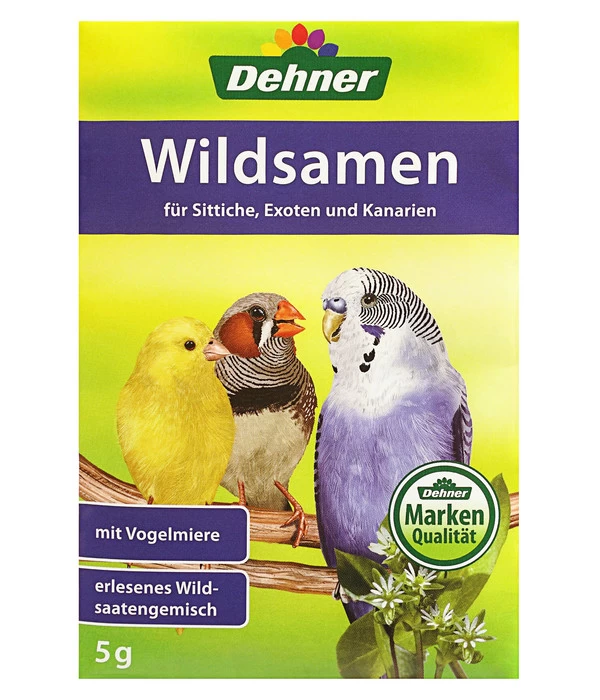 In der freien Natur ernähren sich Vögel neben ihrer normalen Nahrung auch gezielt von Wildsamen, um ihren Speiseplan zu bereichern. Das Dehner Ergänzungsfutter für Vögel gibt es mit verschiedenen Wildsamen. So können Sie Ihren Sittichen, Exoten und Kanarien die gleiche ausgewogene Ernährung bieten, die er in der Natur finden würde.