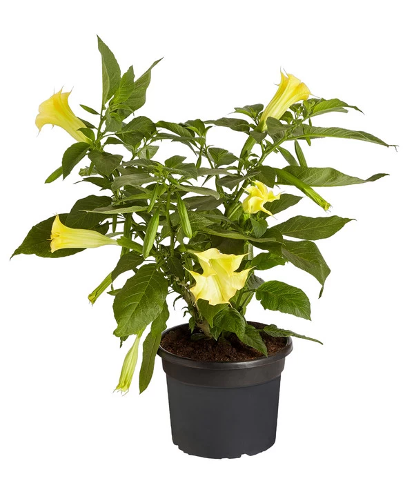 Sie möchten Ihre Terrasse oder Ihren Garten mit etwas ganz Besonderem schmücken? Dann sollten Sie sich unbedingt die Engelstrompete von Dehner näher anschauen. Diese Pflanze stammt ursprünglich aus Südamerika und wird in Ihrer grünen Oase zu einem absoluten Hingucker. An den prachtvollen, hängenden Kelchen haben Sie vom Frühjahr bis zum ersten Frost eine wahre Freude. Die Brugmansia zählt zu den beliebtesten Kübelpflanzen und lässt Sie bei ihrem Anblick die Sorgen und den Stress des Alltags vergessen.