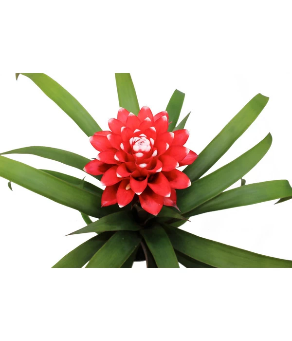 Wie eine glutrote Fontäne erhebt sich die Blüte aus der sattgrünen Blattrosette und es wird kaum einen Pflanzenfreund geben, der davon nicht magisch angezogen wird. Und wie geblendet von dem feurigen Rot werden auch Sie vielleicht erst beim zweiten Blick entdecken, dass diese eindrucksvollen Blütenstände mit schneeweißen Spitzen akzentuiert sind. Ein toller Effekt, der die Leuchtkraft des Rottons nochmals verstärkt! Wobei Sie wahrscheinlich wissen, dass es sich bei diesen sogenannten “Blüten“ der Guzmanie ‘Hope‘ nur um Hochblätter handelt und die richtigen Blüten eher klein und unscheinbar sind. Deshalb gehört diese aus dem Nordwesten Südamerikas und der Karibik stammende Guzmanie ‘Hope‘ auch eher zu den Blattschmuckpflanzen. Bringen Sie noch heute tropische Farbenpower und exotisches Flair in Ihr Zuhause – mit der Guzmanie ‘Hope‘!