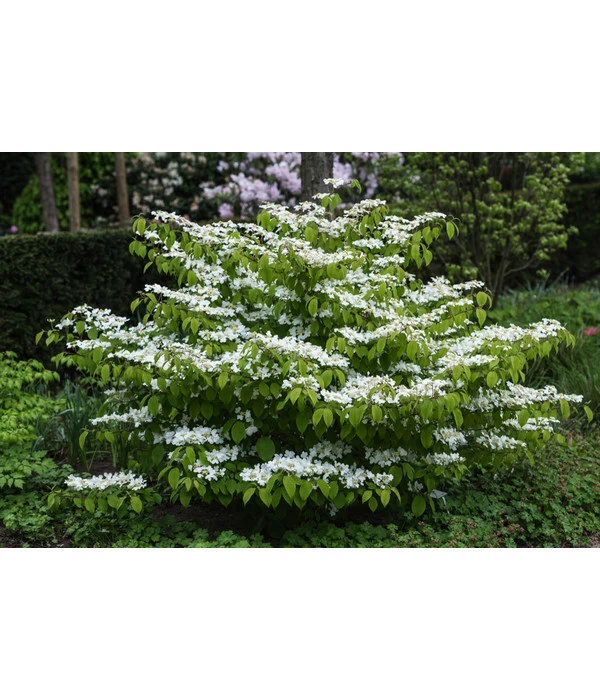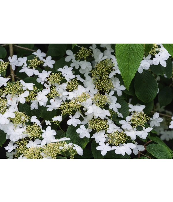 Mit seinem breit ausladenden, etagenförmigen Wuchs ist ein Japanischer Etagen-Schneeball ‘Mariesii‘ schon ohne Blüten eine eindrucksvolle Erscheinung. Wenn sich das Laubgehölz Ihnen aber im Mai und Juni im Schmuck seiner weißen, flachen Schirmrispen präsentiert, die sich im Verblühen überdies noch charmant rosa färben, wird Ihre Begeisterung kein Ende nehmen. Und Sie werden sich jedes Jahr aufs Neue sagen: “Gut, dass ich mich für den Japanischen Etagen-Schneeball ‘Mariesii‘ entschieden habe!“. Denn auch nach der Blüte sind dem Zierstrauch mit seinen fast waagerechten Trieben die bewundernden Blicke aller sicher. Doch das Ziergehölz hat noch eine Überraschung für Sie: Statt sich im Herbst mit einem stillen Laubabwurf sang- und klanglos in die Winterruhe zu verabschieden, rafft sich der Zierstrauch noch einmal zu Höchstleistungen auf und setzt sich mit einer dunkelroten bis violetten Laubfärbung dekorativ in Szene. Dann aber geht auch ein Japanischer Etagen-Schneeball ‘Mariesii‘ schlafen und erwacht erst wieder im Frühjahr.