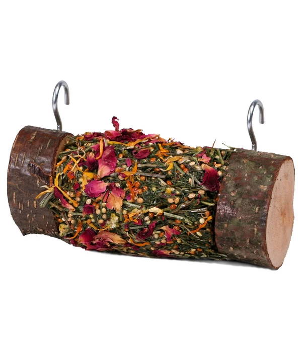 Leckeres mit Holz – das verspricht der Hersteller JR FARM mit seinem Ergänzungsfutter Roll’n’Fun: Zwischen zwei Scheiben Naturholz finden Zwergkaninchen und alle Nager eine leckere Trockenfutter-Mischung aus Blüten und Kräutern auf einem Holzspieß. Zwergkaninchen und Co. können das Futter nach und nach vom Holz knabbern und sind lange beschäftigt und gut versorgt. Der Nagersnack lässt sich einfach an den Haken im Kleintierkäfig aufhängen. Da es sich um einen Snack handelt, sollten Sie immer weiteres abwechslungsreiches Futter für Ihren Nager bereitstellen.
