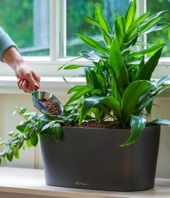 Ein buntes Blütenmeer im Haus oder im Garten? Nie wieder Ärger mit trockener Erde und verkümmerten Pflanzen? Wenn Sie davon träumen, ist der LECHUZA® Cubeto Stone das ideale Gefäß für Ihre Wünsche. In die elegante und glatte Schale passen bis zu sieben verschiedene Pflanzen. Bestellen Sie den LECHUZA® Cubeto Stone am besten im praktischen All-In-One-Set mit dem intelligenten Erdbewässerungssystem. Der integrierte Wasserspeicher sorgt für eine kontinuierliche Versorgung der Pflanzenerde mit Wasser – so bleibt alles frisch. Die Handhabung ist bequem: Am Wasserstandsanzeiger können Sie jederzeit mit einem Blick ablesen, wann sie das Reservoir auffüllen müssen. Insgesamt fasst das Gefäß bis zu drei Liter Wasser, so dass die Pflanzen auch gut versorgt sind, wenn Sie nicht jeden Tag nach ihnen schauen können. Durch das einfache Entfernen der Bodenschraube verhindern Sie, dass sich Staunässe bildet.