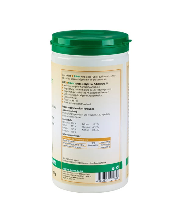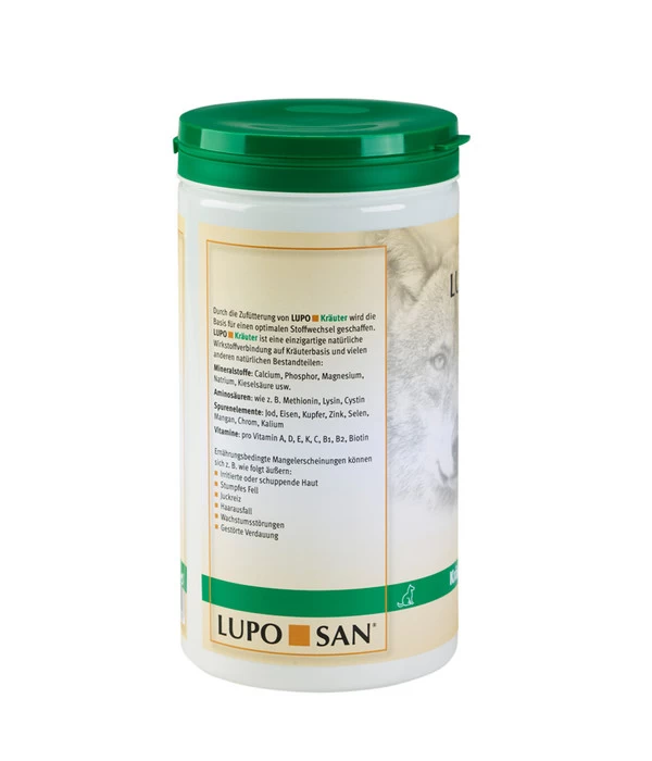 Sie suchen für Ihren geliebten Hund eine gut zu handhabende Nahrungsergänzung, die eine Grundlage zur Förderung seines Stoffwechsels anbietet? Dann ist das Ergänzungsfutter LUPO Kräuter Pulver der Marke LUPOSAN bestimmt das richtige Produkt für Sie und Ihre Fellnase. Algen und viele verschiedene Kräuter bilden unter anderem die Basis, mit der das LUPOSAN Ergänzungsfutter LUPO Kräuter Pulver beispielsweise für eine gesunde Haut sowie ein glänzendes Fell bei Ihrem Vierbeiner sorgt, die Abwehrkräfte unterstützt oder die Nährstoffaufnahme verbessern kann.