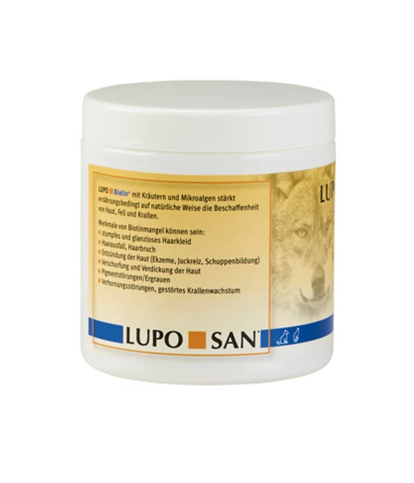Sie wollen für Ihren Liebling nur das beste und geben ihm nur hochwertiges Futter? Auch bei einer ausgewogenen Ernährung kann es sein, dass Hunde und Katzen einen Biotin-Mangel entwickeln. Eine Folge davon können Haarausfall, ein glanzloses Fell, trockene Haut und brüchige Krallen sein. Mit den hochwertigen LUPOSAN Ergänzungsfutter LUPO Biotin+ Tabletten gehen Sie hier auf Nummer sicher – für ein optimales Wohlergehen Ihres Vierbeiners.