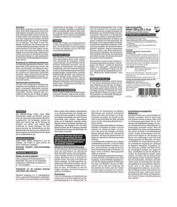 Ein besonderer Vorteil von PROTECT HOME Rodicum® Ratten Portionsköder: Das Mittel ist enorm witterungsbeständig, so dass Sie die Schadnager auch unter feuchten Bedingungen wirksam bekämpfen können, also in allen • Wohnbereichen, • in Dachböden, • Waschküchen, • Kellern, • Gartenlauben, • Geräteschuppen usw. Noch ein Pluspunkt: Sie können auch zu PROTECT HOME Rodicum® Ratten Portionsköder greifen, wenn plötzlich Mäuse bei Ihnen auftauchen.