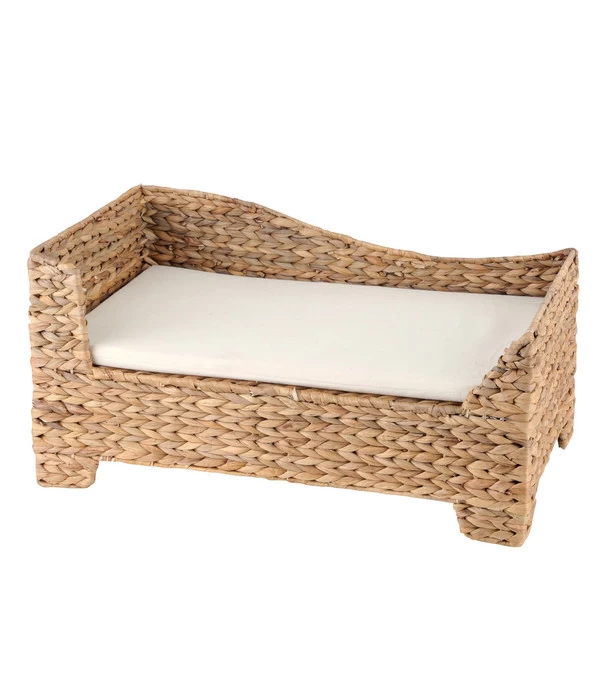 Die Heimtier Ottomane mit ihrem bequemen Kissen ist perfekt für kleine Hunde und Katzen geeignet. Das Flechtwerk aus Wasserhyazinthen auf stabilem Metallrahmen gibt dem Hundesofa oder Katzenbett die notwenige Stabilität. Das weiche Kissen macht den Liegeplatz besonders bequem. Ob Katze oder kleiner Hund, das bequeme Sofa wird in Kürze zum Lieblingsplatz, um dort ganz entspannt ein Nickerchen zu machen. Praktisch ist zudem, dass das Kissen bei 30° gewaschen werden kann. Egal ob Sie es als Hundesofa oder Katzenbett verwenden, auf dieser weichen Ottomane haben Ihre Haustiere einen bequemen Rückzugsplatz und werden sich mit Sicherheit wohl fühlen. Sie erhalten das Hundesofa mit einer Größe von 52x33x27 cm, wobei sich die angegebenen Maße auf die Außenmaße, nicht auf die Größe der Liegefläche beziehen.
