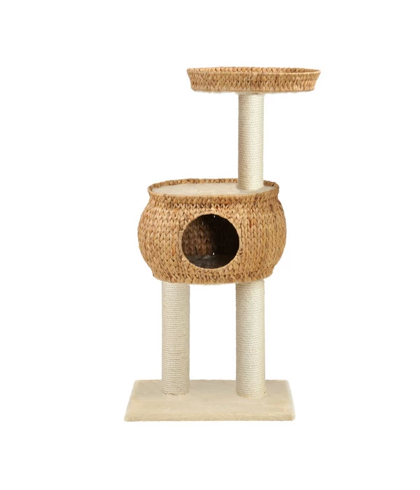 Der Silvio Design Kratzturm Cestino ist ein Kratzbaum, der weiches Flechtwerk und kuscheliges Plüsch vereint und Ihrer Katze verschiedene Ruhemöglichkeiten bietet. Der stabile Kratzbaum Cestino bietet Ihrer Katze mit der gemütlichen und geräumigen Wohnhöhle und den kuscheligen Liegemulden diverse Ruheorte. Das Metallgestell der Höhle und der Liegemulde sorgt für Stabilität und ist mit einem weichen Geflecht aus Wasserhyazinthen versehen. Die geräumige Wohnhöhle mit dem weichen Plüschkissen lädt zum Schlafen ein, bietet sich gleichzeitig aber als Rückzugsort und Versteck an. Sowohl die Liegemulde über der Höhle als auch die einzelne Liegemulde sind mit einem weichen Plüschkissen versehen, die für absolutes Wohlbefinden beim Relaxen sorgen. Die Bodenplatte, welche mit für Stabilität sorgt, wurde ebenfalls mit Plüsch bezogen. Die massiven Holme sind mit Sisal umwickelt, an denen die Katze jederzeit Ihre Krallen pflegen kann. Der Kratzbaum Cestino von Silvio Design bietet Ihrer Katze verschiedene Schlaf- und Ruhemöglichkeiten und wird schnell zum Lieblingsplatz Ihrer Katze.