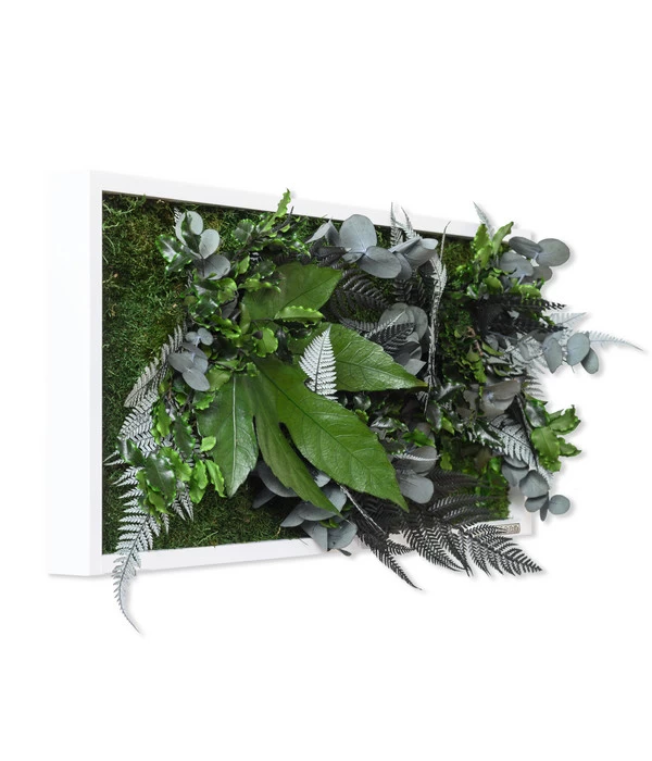 Als Pflanzenliebhaber sind Sie stolz auf Ihren Zimmerdschungel, der für ein herrlich belebtes Ambiente sorgt. Aber die Wand über dem Sofa ist noch vollkommen frei. Und damit genau der richtige Ort für dieses Bild im Dschungeldesign. Denn Zimmerdschungel geht auch vertikal! Mit echten Pflanzen, die im aufwendigen Verfahren natürlich konserviert wurden. Das Ergebnis sind Moose und Blätter, die ihr komplettes, natürliches Aussehen dauerhaft behalten dürfen. An Ihrer Wand, in Ihrem Wohnzimmer oder wo immer es Ihnen gefällt. In einem weißen Holzrahmen von Hand arrangiert wirkt es wie ein Blickmagnet, an dem Sie sich nicht werden sattsehen können. Auch Ihre Familie und die Freunde werden begeistert sein. Denn schließlich bekommt man nur selten einen ganzen Dschungel zu sehen, der an einer Wand wächst! Hauchen Sie also Ihrem Wohnraum mit diesem Bild im Dschungeldesign ein völlig neues Flair ein!