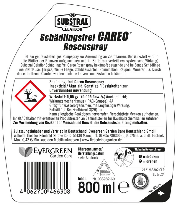 Wenn eine Pflanze befallen ist und man sich die Mühe machen muss, alle Blätter von beiden Seiten zu besprühen, sollte vorab sichergestellt sein, dass die Wirkung auch alle möglichen Fälle abdeckt. Mit Substral® Celaflor® Schädlingsfrei Careo® sind Sie auf der sicheren Seite. Denn es erreicht alle beißenden und saugenden Schädlinge wie Spinnmilben, Grüne Blattläuse, Wollläuse, Raupen, Weiße Fliegen, Thripsen oder auch Käfer und Minierer. Substral® Celaflor® Schädlingsfrei Careo® wirkt durch den Wirkstoff Acetamiprid und ein zugesetztes pflanzenverträgliches Öl. Der Wirkstoff wird direkt über die Blätter aufgenommen und im Saftstrom der Pflanze verteilt, um dann vollsystemisch zu wirken. Durch das enthaltene Öl bekämpfen Sie außerdem auch Larven- und Ei-Stadien.