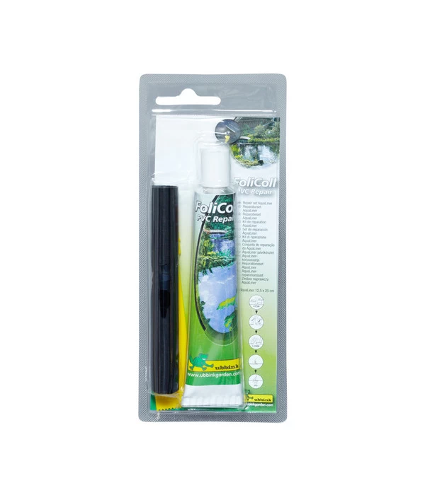 Kleine Risse in der Gartenteich-Folie zu reparieren geht ganz leicht mit dem Komplett-Set von Ubbink. Neben einem Stück stabiler PVC-Folie enthält das Set einen starken Kleber sowie einen Kunststoffspachtel. So reparieren Sie die Folie zuverlässig und vermeiden Wasserverlust im Gartenteich.