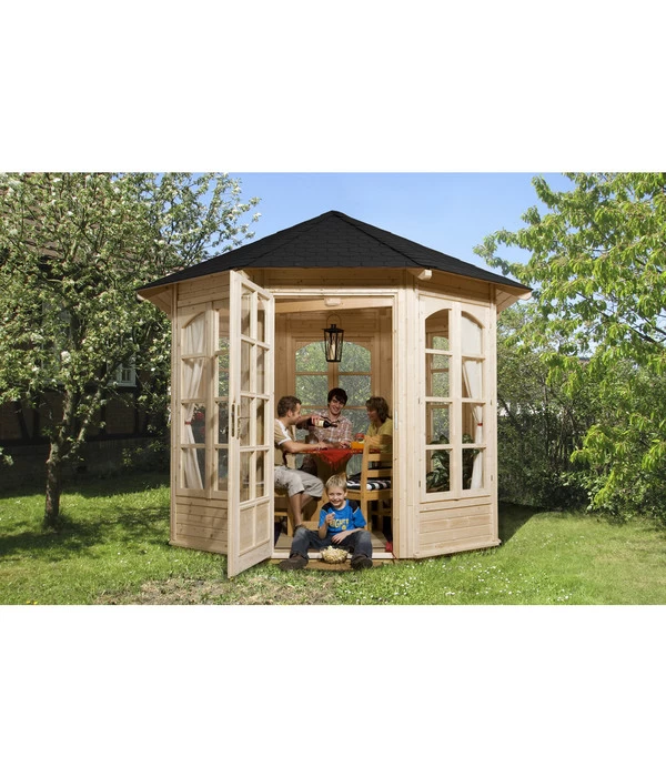 Sie genießen dort den ersten Erdbeerkuchen, während die Frühlingssonne durch die großzügigen Sprossenfenster scheint, später im Jahr sitzt nach dem Grillevent der engste Kreis Ihrer Freunde noch bis lange nach Mitternacht zusammen und genießt die lauschige Atmosphäre in Ihrem Weka Pavillon 234 B. Wie gut, dass Sie sich für diesen Gartenpavillon entschieden haben! Denn nirgendwo anders sitzt man so unmittelbar im Grünen, mit einem wunderbaren Panoramablick auf Ihren Garten und ist dank der geschlossenen Bauweise trotzdem angenehm geschützt. Lassen Sie sich nie mehr von einem kühlen Wind ins Haus vertreiben, sondern verbringen Sie viele schöne Stunden in Ihrer neuen Wohlfühloase – dem Weka Pavillon 234 B!