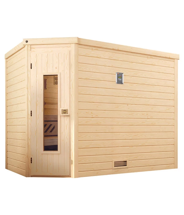 Gemeinsam mit Kindern in der Sauna schwitzen und entspannen ist in den nordischen Ländern, vor allem in Finnland, durchaus üblich. Auch bei uns wird der Saunabesuch mit der ganzen Familie immer beliebter, denn was dem erwachsenen Körper guttut, hat auch bei Kindern den gleichen positiven Effekt: das Herz-/Kreislauf-System wird trainiert und die Abwehrkräfte gestärkt. Natürlich sollten die Kleinen erst langsam an die ungewohnte Hitze gewöhnt werden und am Anfang nur wenige Minuten in der Saunakabine bleiben, später aber werden Sie gemeinsam viel Spaß beim Schwitzen haben. Mit der Weka Sauna Turku mit Holztür können wir Ihnen ein klassisches Saunamodell vorstellen, das perfekt für das Saunieren im finnischen Stil gemacht ist. Es ist mit insgesamt 3 Liegen ausgestattet – zwei Längsliegen mit Kopfstützen und eine Querliege, so dass die ganze Familie bequem Platz finden wird. Richten Sie sich mit der Weka Sauna Turku mit Holztür gleich eine komfortable Familien-Sauna ein – wir wünschen Ihnen viele vergnügliche und entspannte Stunden!