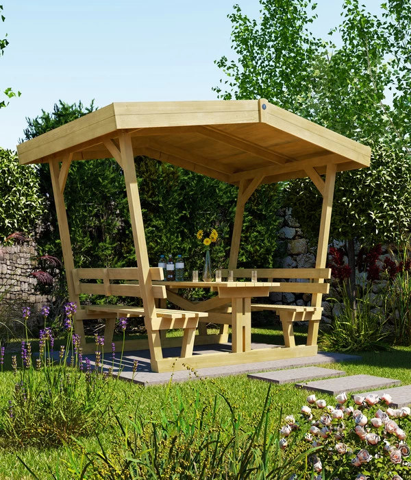 Die Nordischen Hölzer wurden wetterfest imprägniert – so kann Ihre Laube jahrein, jahraus draußen im Freien stehen
