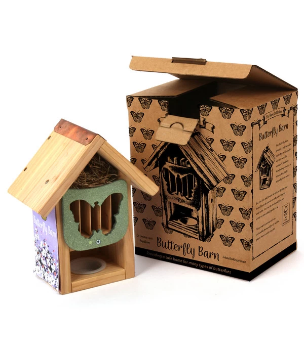 Wussten Sie, dass es allein in Deutschland mehr als 3000 Schmetterlingsarten gibt? Und dass nicht alle als Puppe überwintern, sondern dass manche in den Süden ziehen und andere an geschützten Orten in unseren Gärten überwintern? Besonders gerne werden sie dazu das Wildlife Schmetterlingshaus nutzen, das Sie vielleicht bald in Ihrem Garten aufhängen. Die hübsche Schmetterlingsscheune bietet aber auch Motten, Florfliegen und anderen bestäubenden Insekten einen sicheren Unterschlupf, an den sie sich im Sommer bei schlechtem Wetter zurückziehen können. Das Wildlife Schmetterlingshaus besteht aus FSC®-zertifiziertem Holz, die Vorderfront ist aus recyceltem Kunststoff gefertigt. Die Tür ist schwenkbar und ermöglicht den bequemen Zugang zum Nistfach, um es zu reinigen oder zur Beobachtung der Schmetterlinge. Und weil Sie das Schmetterlingshaus von Wildlife in einer attraktiven Geschenkbox erhalten, sollten Sie am besten gleich zwei besorgen: eins für sich selbst und eines zum Verschenken!