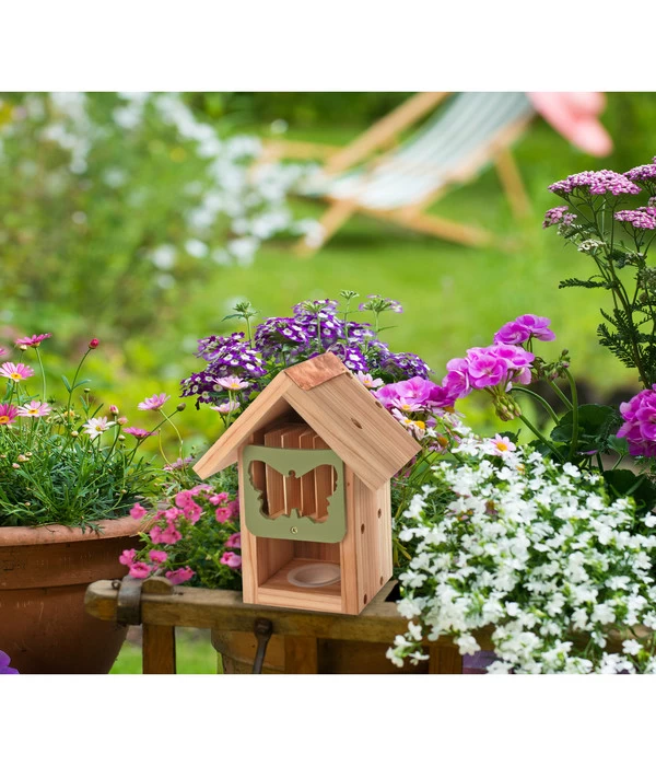 Vor allem im zeitigen Frühling oder im Spätsommer, wenn das natürliche Nahrungsangebot im Garten knapp ist, können Sie den Behälter unter dem Nistfach mit Schmetterlingsfutter, mit überreifen Früchten oder einer Zuckerwasserlösung befüllen, um die fröhlichen Gaukler zu unterstützen. Und natürlich sollten auch ein paar Schmetterlingspflanzen wie zum Beispiel ein Sommerflieder, Lavendel, Sonnenhut oder Flammenblumen in der Nähe des Schmetterlingshauses wachsen.